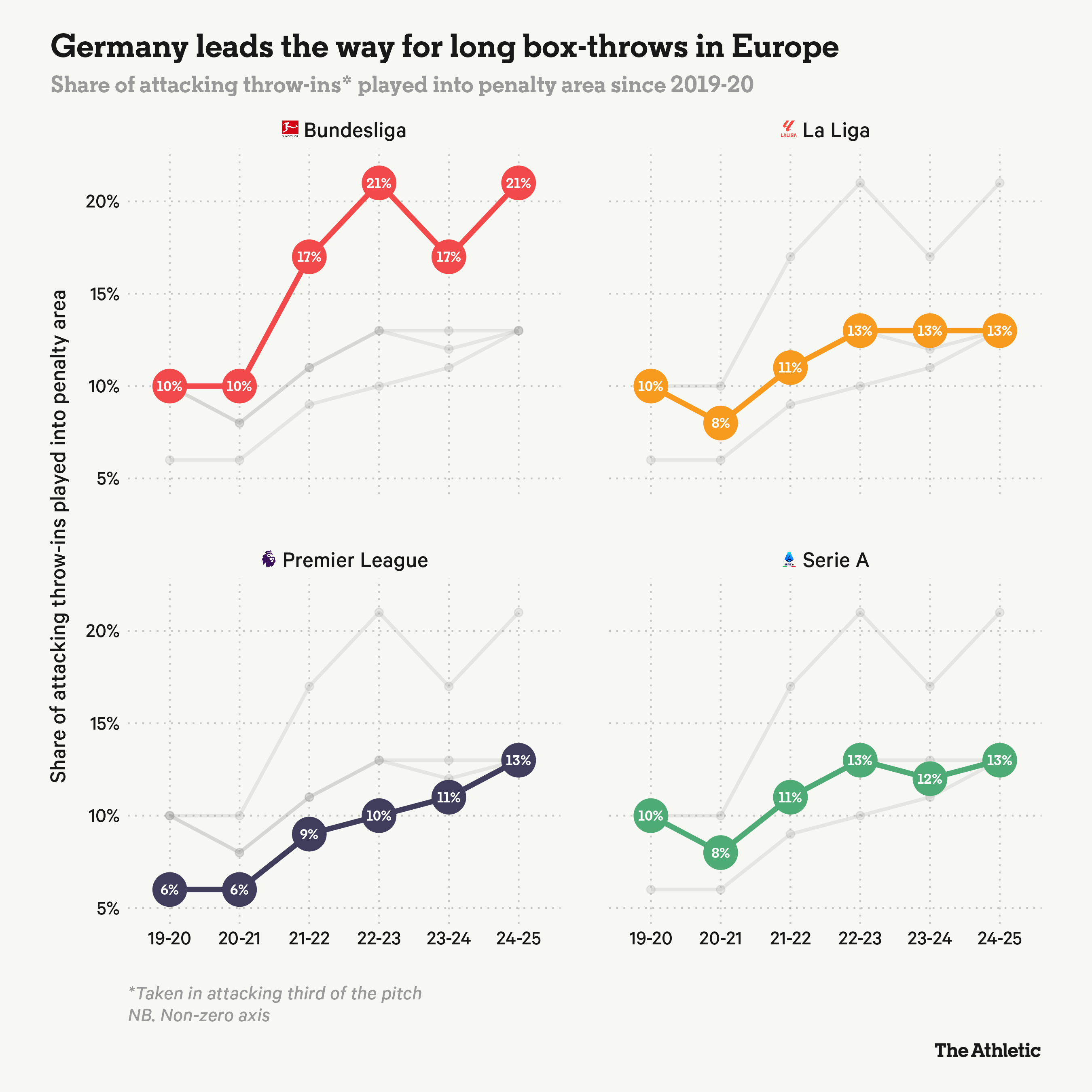 有趣的是,英超并非欧洲大陆大力界外球趋势的引领者。尽管自2019-20赛季以来,英超的使用率逐年上升,但德甲才是欧洲四大顶级联赛中大力界外球的最大拥趸。