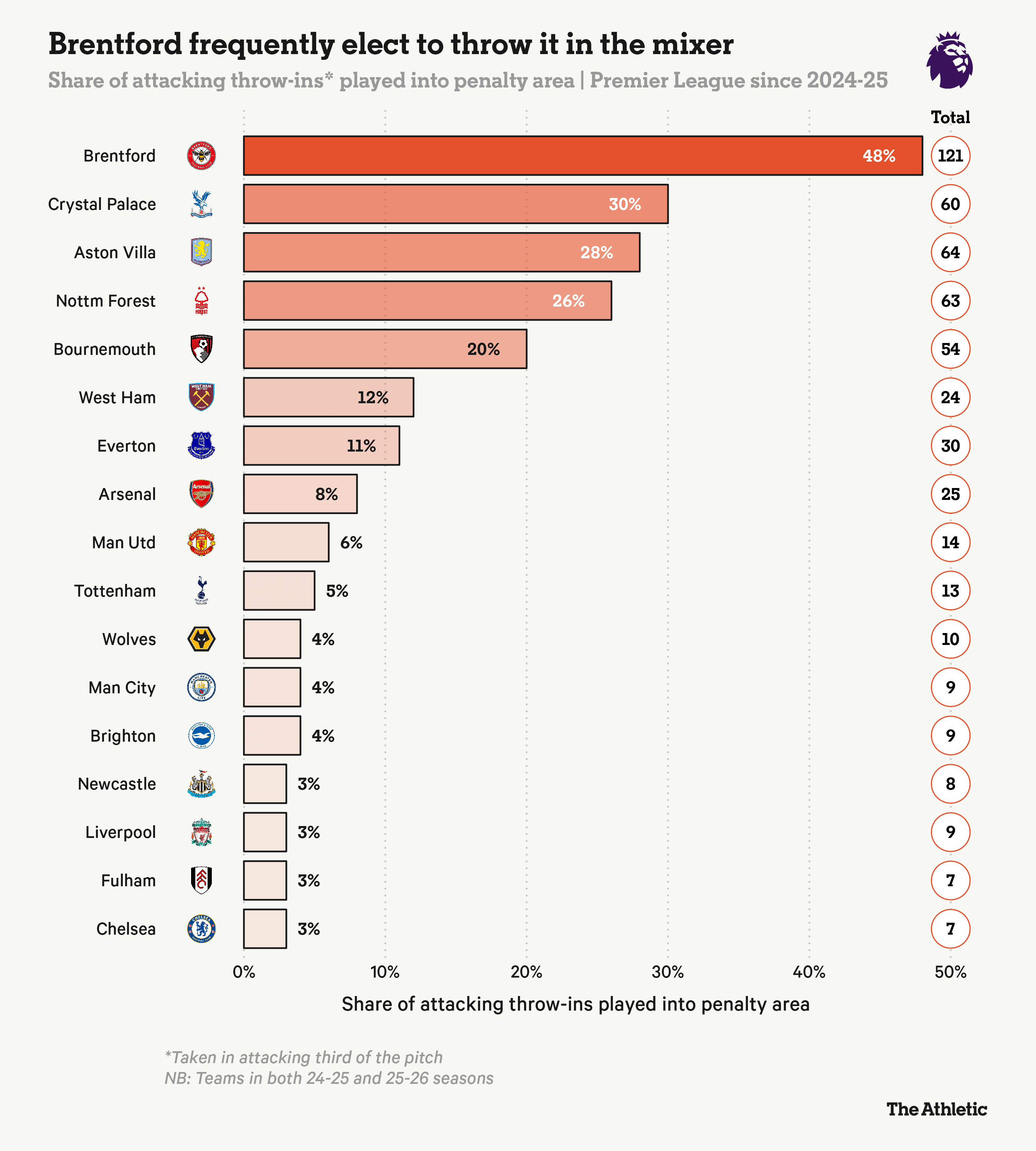 上赛季,布伦特福德在进攻性界外球中选择将球掷入禁区的次数超过任何其他英超球队(121次)。随着新赛季基斯-安德鲁斯(前定位球教练)接任主帅,布伦特福德继续利用这一战术,成为英超中最突出的大力界外球使用者。